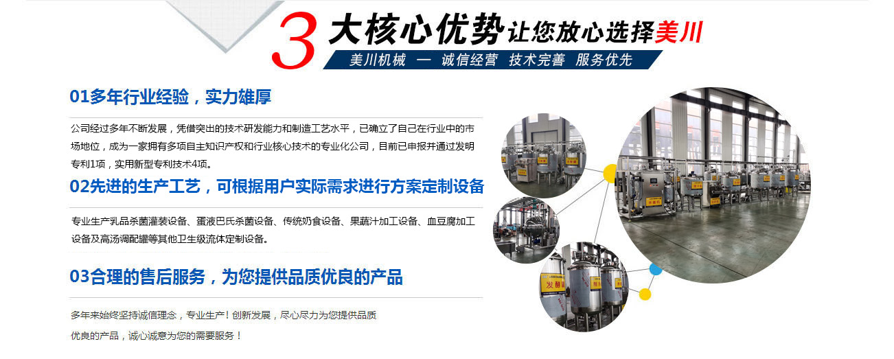 諸城市美川機械有限公司坐落在美麗的恐龍之鄉——山東省諸城市東部,始建于2009年,是一家集乳品殺菌灌裝、蛋液殺菌、傳統奶食、果蔬汁加工、血豆腐加工、高湯調配等設備研發、工藝設計、生產制造、安裝調試,生產技術專業培訓,整線規劃為一體的智能化衛生級流體生產線一站式供應商,目前擁有4個系列20多種產品,產品遠銷30多個國家和地區。